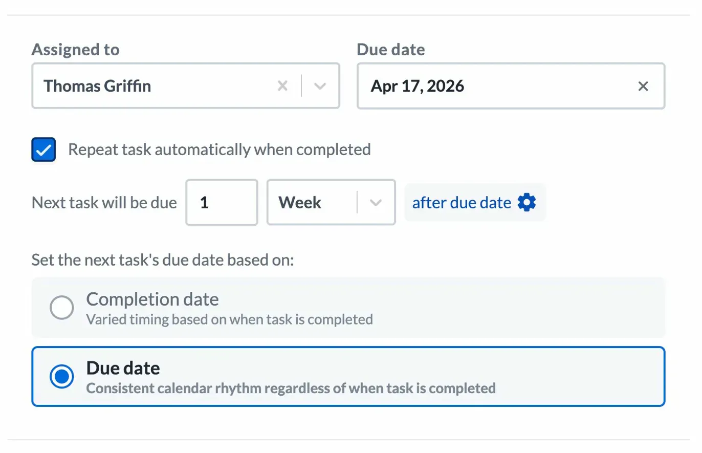 - Due date: The next task's due date is always calculated from the original due date — not when you actually completed it. This gives you a consistent calendar rhythm regardless of when the task gets done. If your task is due every Friday, the next one is always due the following Friday, even if you complete it on Monday.