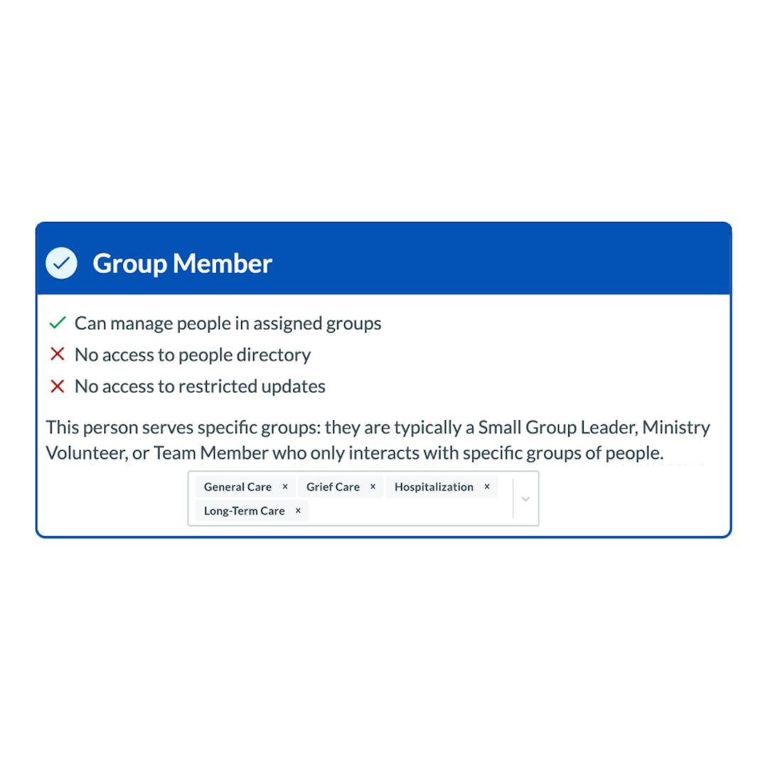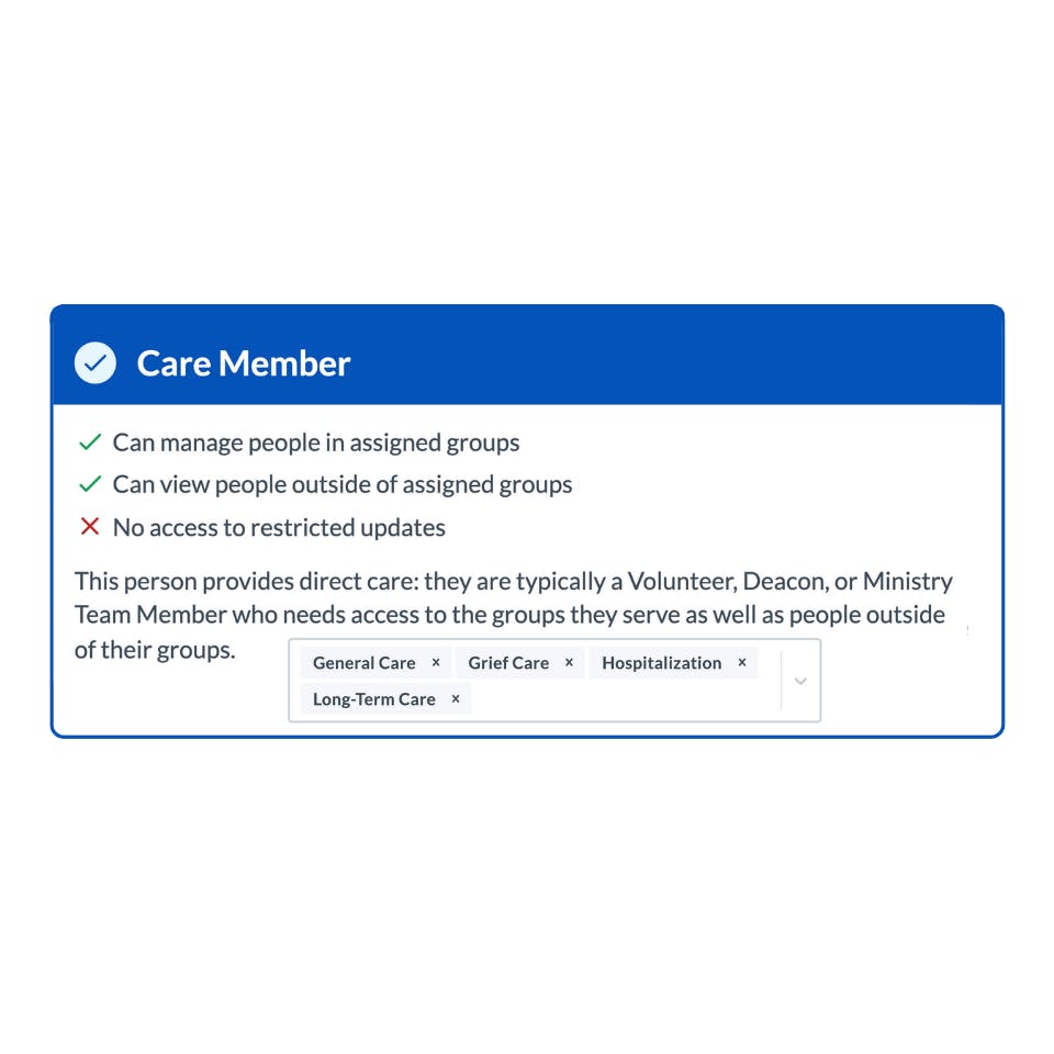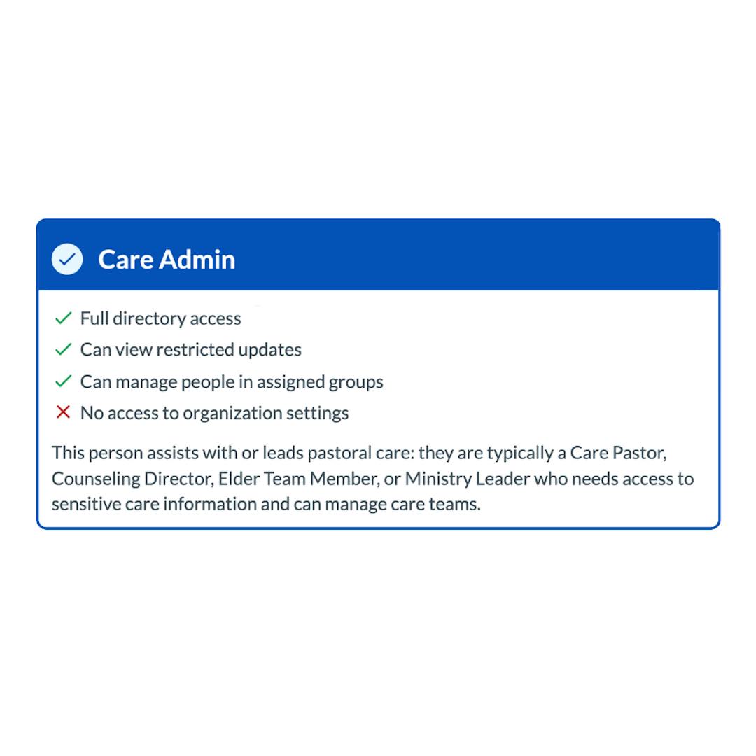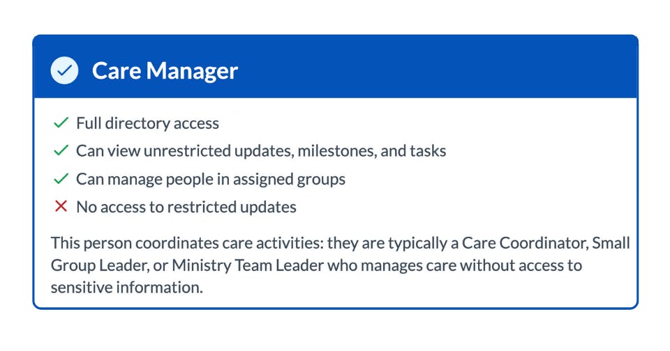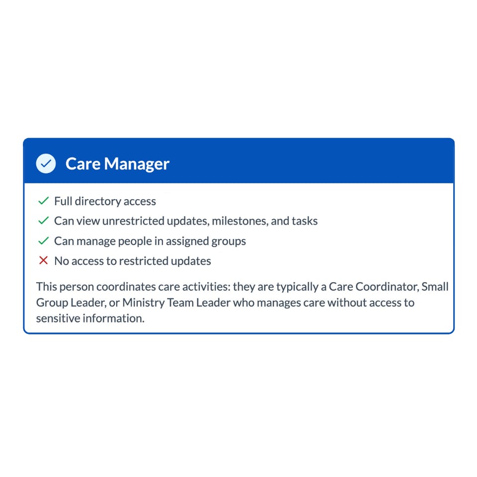 This role is ideal for care coordinators, ministry team leaders, deacons and even small group leaders who might oversee care activity but don't need access to sensitive care information.