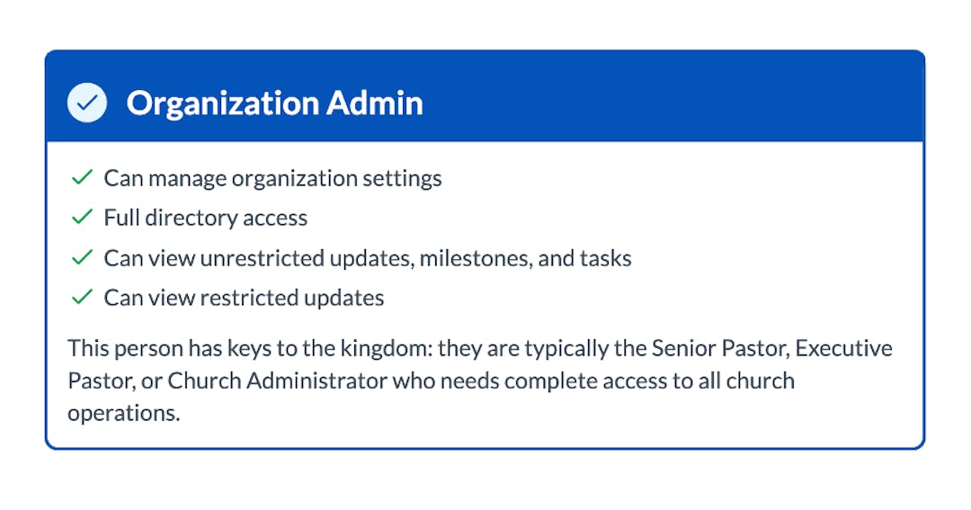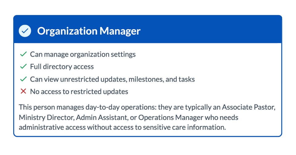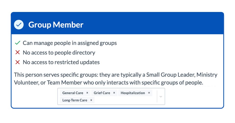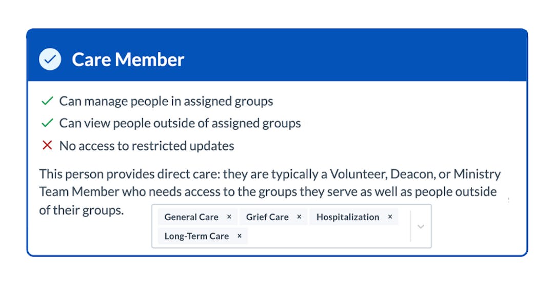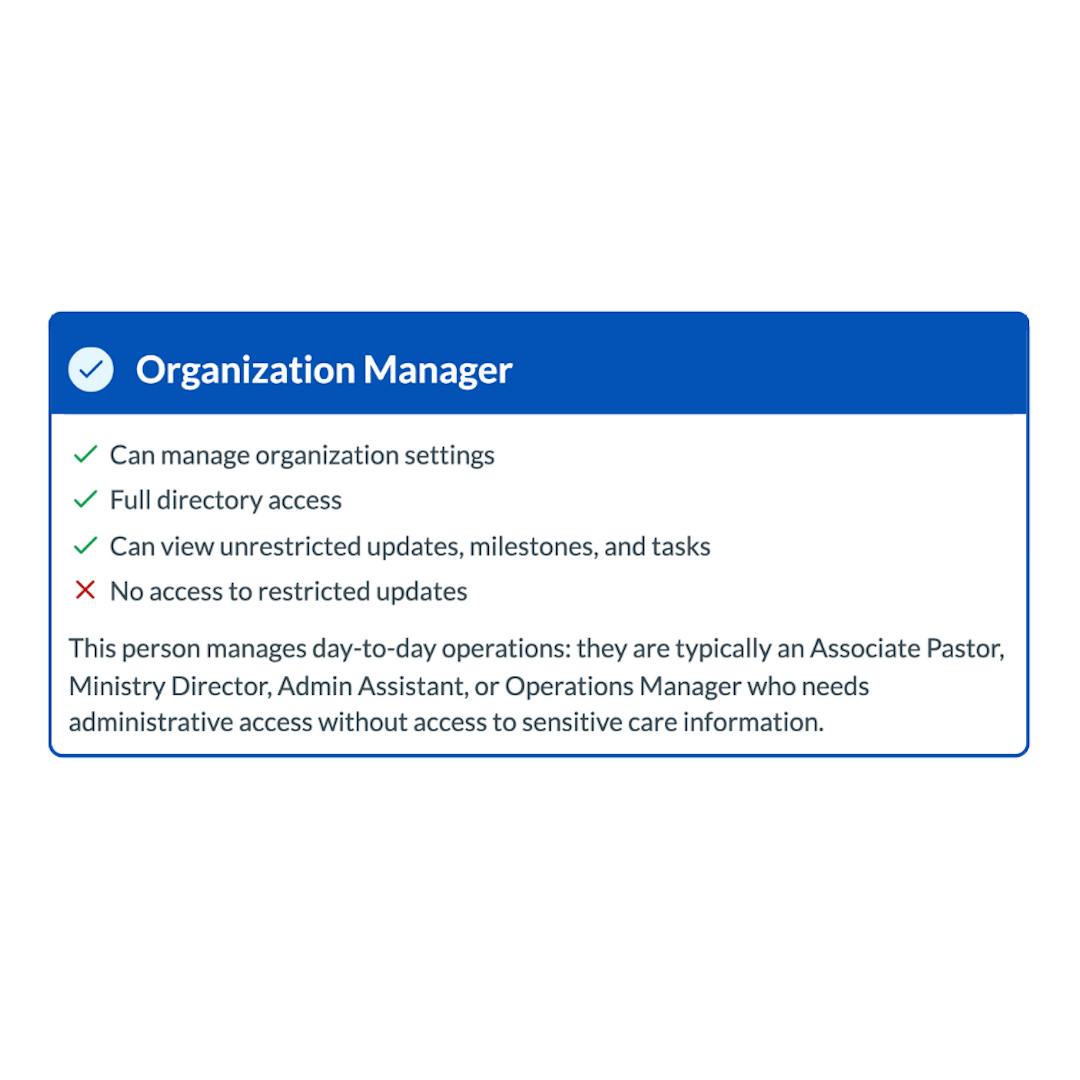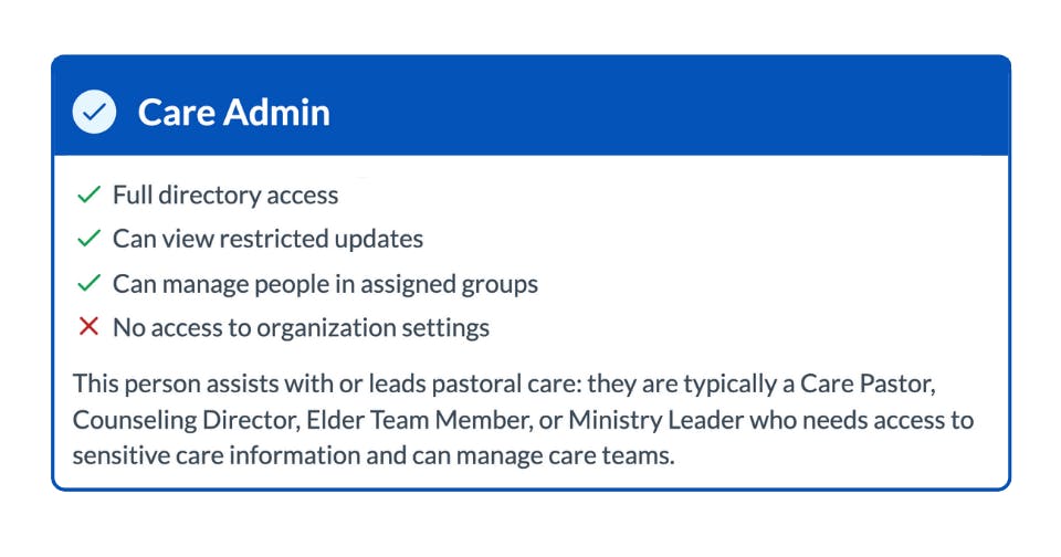 This role is ideal for care coordinators, ministry team leaders, deacons and even small group leaders who might oversee care activity but don't need access to sensitive care information.