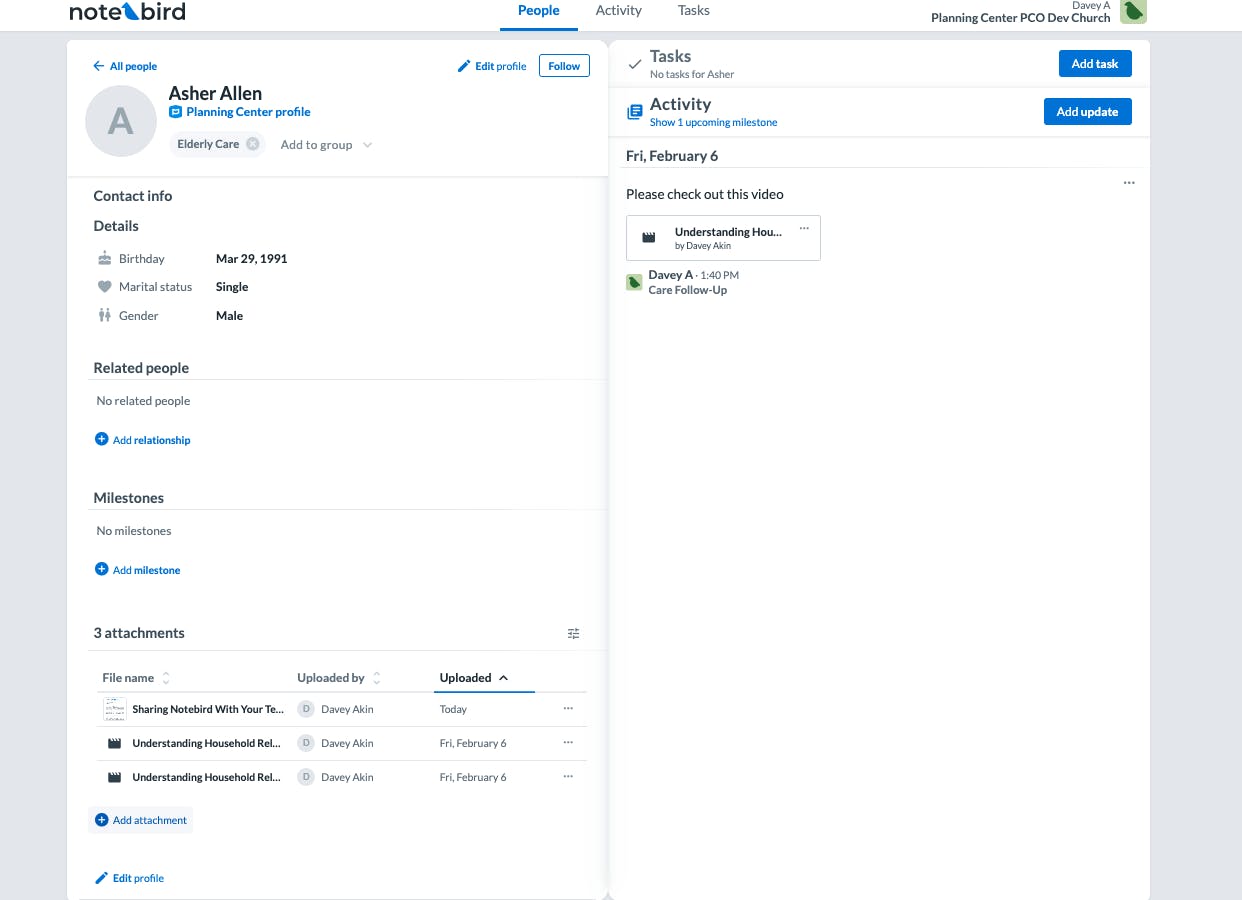 We've been hard at work on some features that we're really excited to share with you. If you've ever wished you could attach a document to a person's profile, or wished you had more control over which people sync into your Notebird account from your church management system: today's your day.
