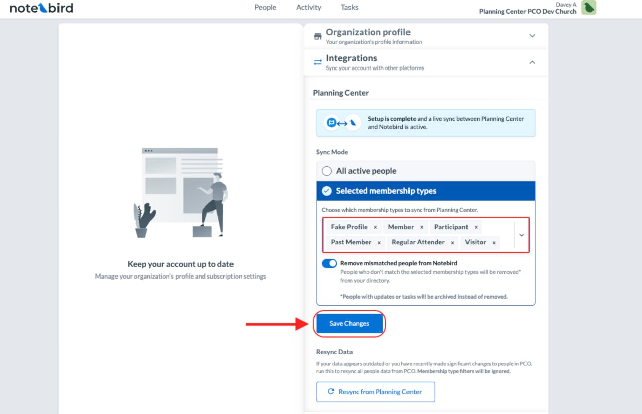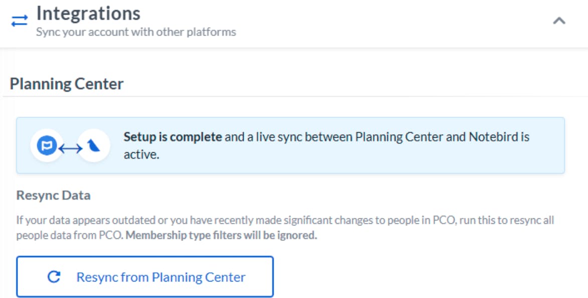 If you're using Planning Center Online (PCO), this is where it gets really powerful. You can now sync your membership types directly from PCO into Notebird. Just visit your account integrations area, hit the "Resync PCO" button, and Notebird will pull down all your membership types automatically.