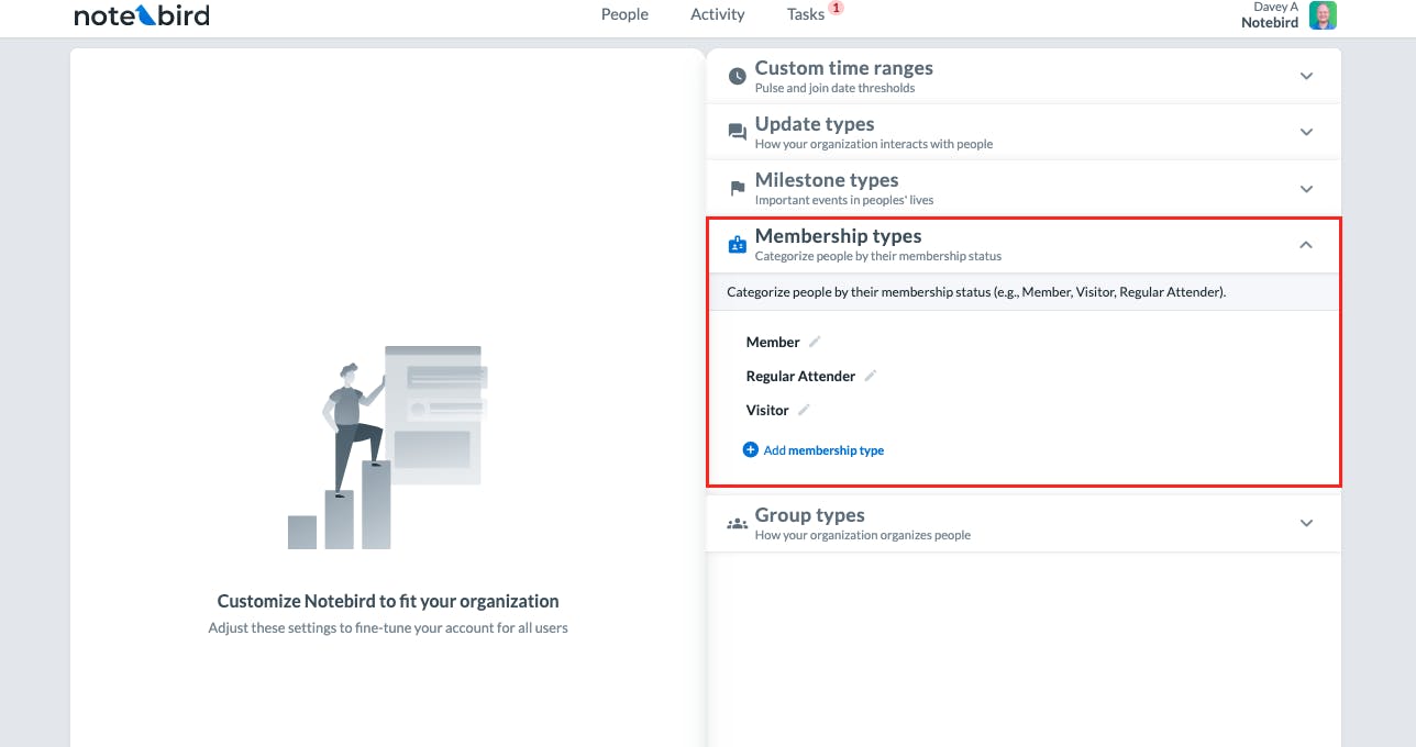 Membership Types solve this. You can now categorize people in Notebird by their membership status — things like Member, Visitor, Regular Attender, or whatever categories make sense for your church. You'll find these under your account customizations screen, right alongside your update types, milestone types, and other custom settings.