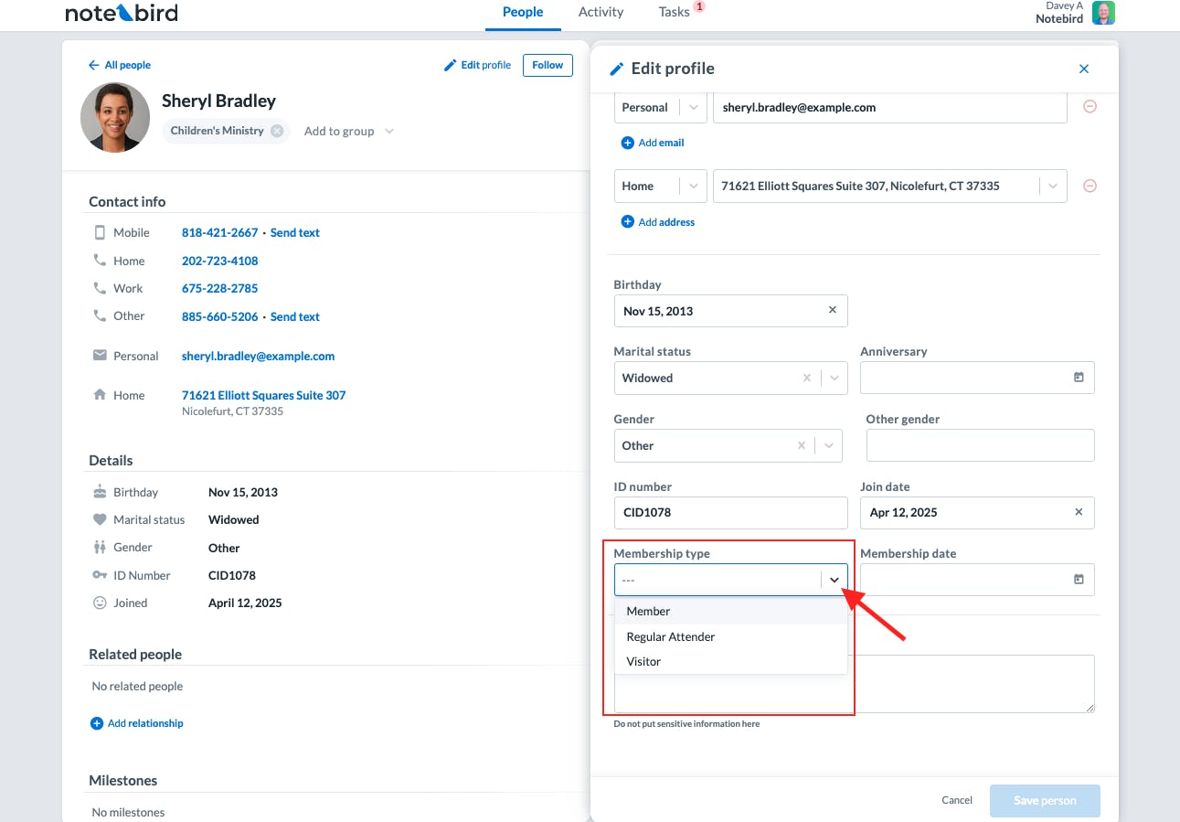 This means you can filter the people in your account by membership type. Want to focus your care efforts only on active members? You can do that. Want to see just your regular attenders or visitors? Done. It gives your team the ability to keep your Notebird account clean and focused on the people who need dedicated care.